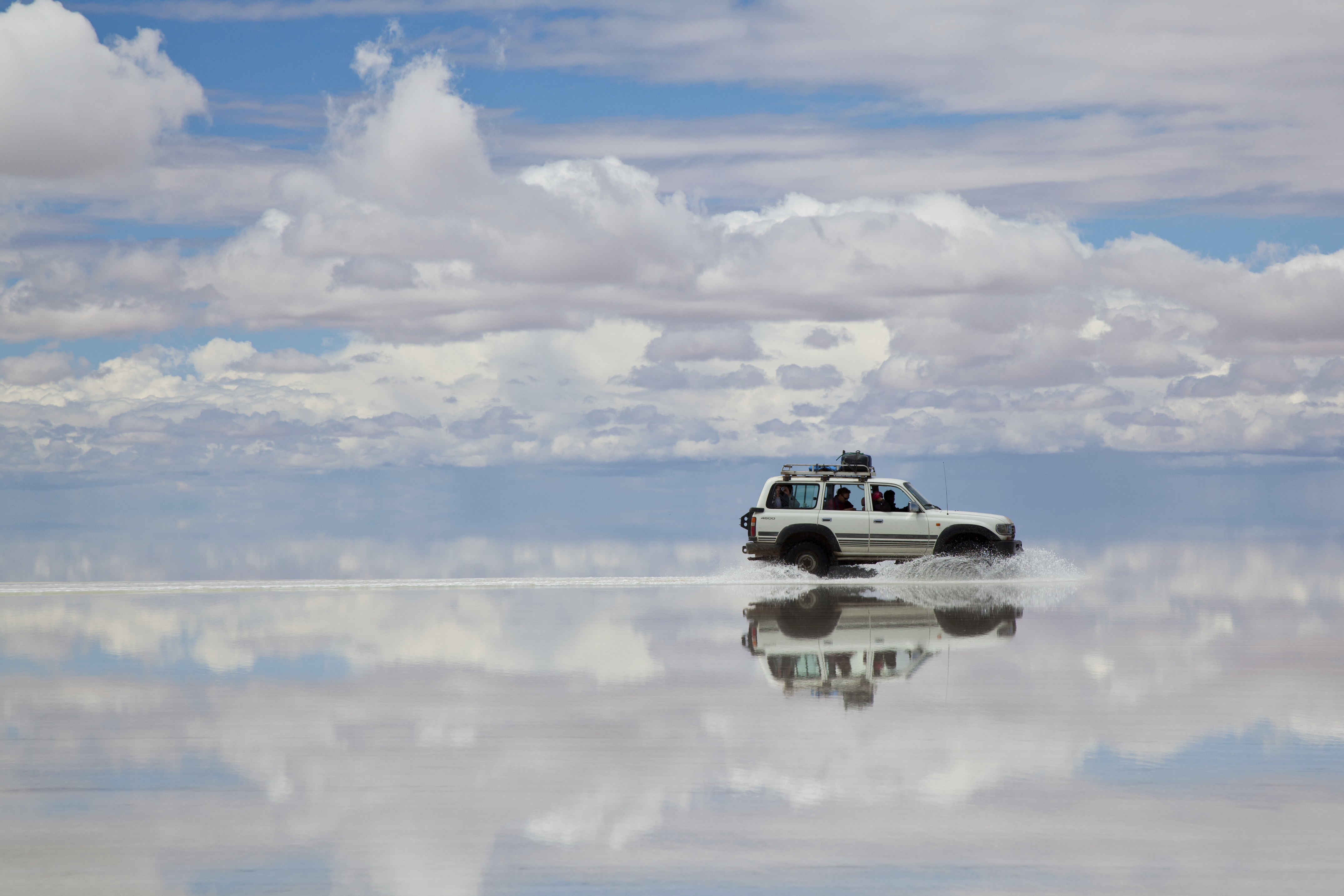 是世界最大的鹽湖,面積達10,582平方公里,位於海拔3,700公尺的山區,本是一片荒漠之地,以前只有採鹽者才到,後來卻因一個個鹽堆形成獨特風景,還有雨後地上積水倒映天空的奇妙畫面,吸引世人的目光,逐成為遊客首選的人間天堂。玻利維亞是南美最貧窮落後的國家之一,卻因為一面「天空之鏡」成為全球人心目中的聖地。