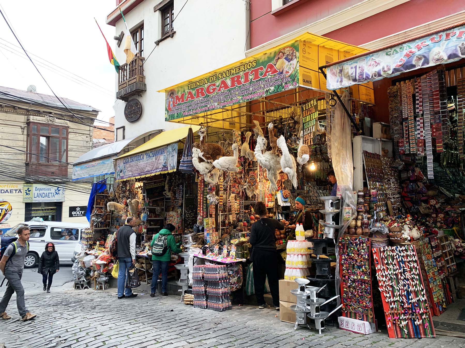 大大小小的攤位和沿街的小店舖裡販賣各種各種各樣的巫術及祈福用具的街頭市場,可見售賣駱馬胚胎,據說是當建新屋時埋在地下辟邪用,還有地道手工藝品小商店。
