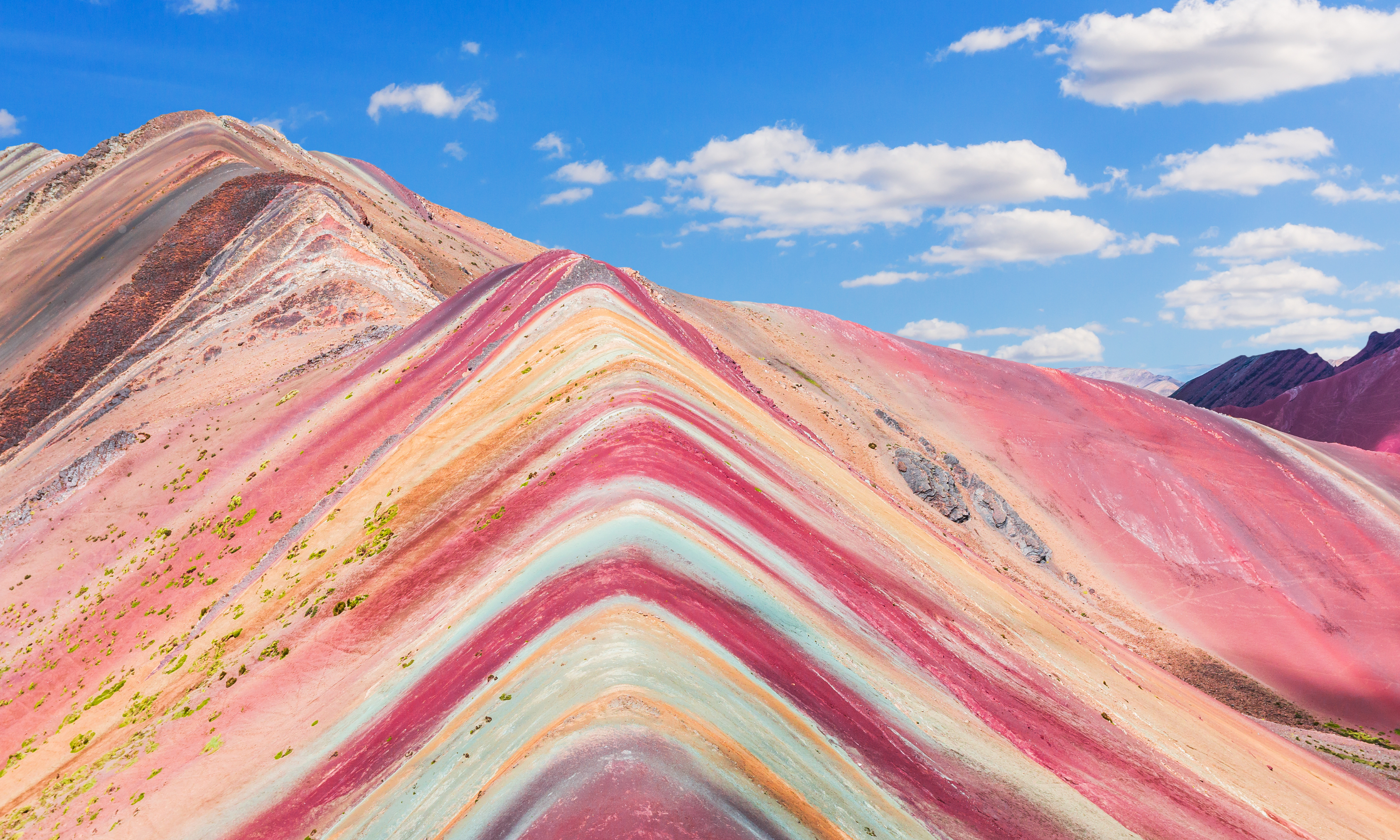 位於安地斯山脈的七彩山麓,因顏色繽紛而有「彩虹山」稱號,這座層次分明的美麗山脈位於海拔高達5000公尺以上,是屬於少見的「丹霞地貌」,所謂「丹霞地貌」是指一種沉積在內陸盆地的紅色岩層,這種岩層經過千百萬年以上的地質變化過程、被水切割侵蝕,最後才形成了我們眼睛所見的「紅色山麓」。