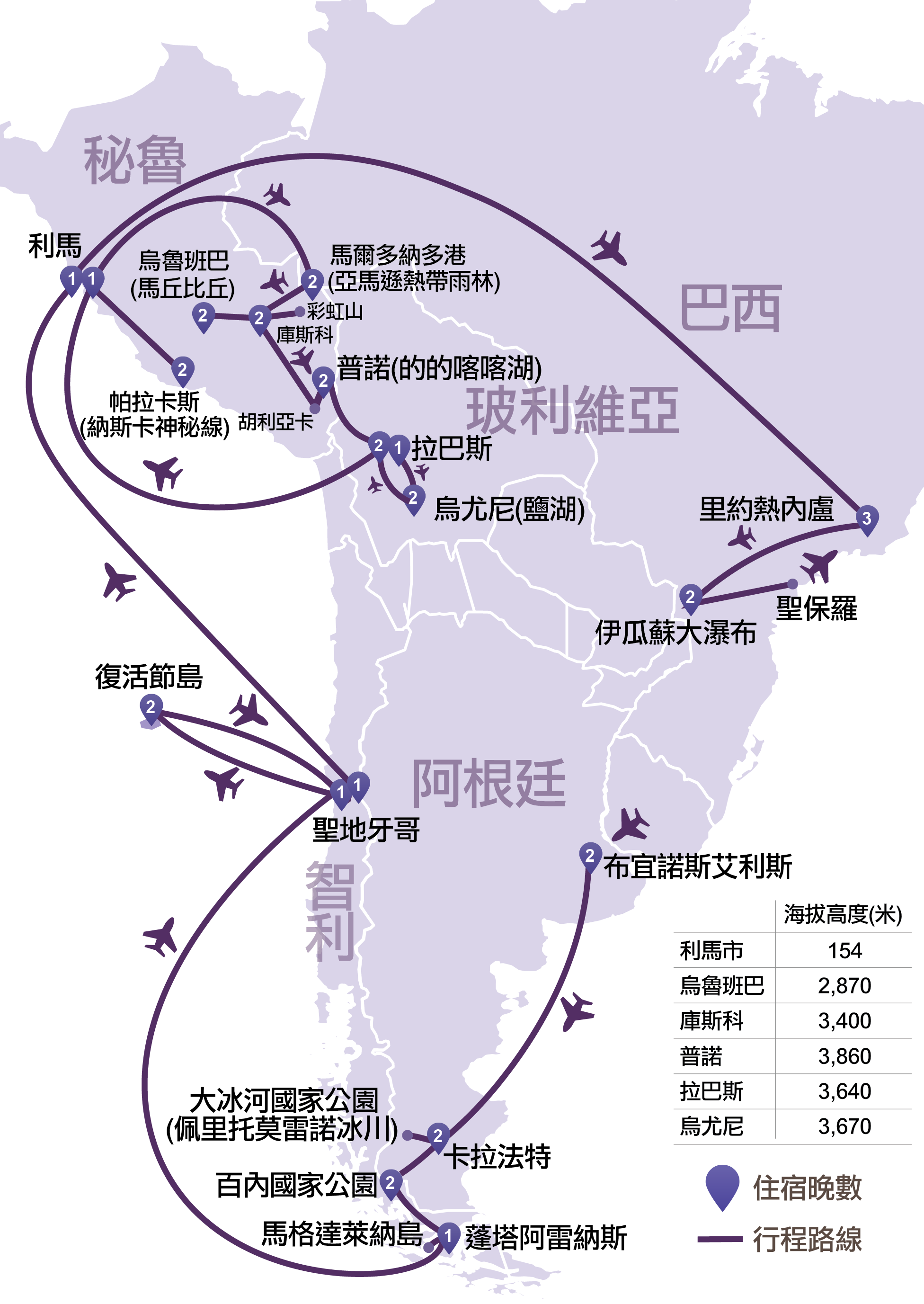 秘魯 :利馬、坦博帕塔國家自然保護區(亞馬遜雨林)、庫斯科、 烏魯班巴、馬丘比丘古城、彩虹山、胡利亞卡、普諾(的的喀喀湖)、帕拉卡斯、巴雷斯塔思島