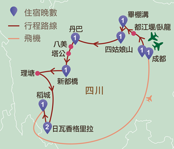 四川:成都、都江堰、臥龍、畢棚溝、四姑娘山、丹巴、八美、塔公、新都橋、理塘、稻城、日瓦、亞丁