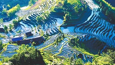 梯田由秦漢時期已初步成型,至今已有2000多年歷史。八萬餘畝的梯田美景,從海拔500米延伸至1200米,層層迭迭,氣勢恢宏。四季的景色各有風貌,春季水滿田疇如鏡如畫,夏季佳禾吐綠青翠欲滴,秋季金黃色稻浪起伏遍佈山坡,冬季漫山瑞雪銀裝素裹。