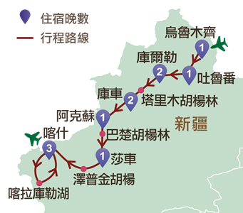 烏魯木齊 、吐魯番、庫爾勒、尉犁羅布人村寨、輪台塔里木胡楊林公園、庫車、天山溫宿大峽谷、阿克蘇、巴楚紅海胡楊公園、塔里木盆地、塔克拉瑪幹沙漠、莎車、澤普金胡楊國家森林公園、喀什、喀拉庫勒湖