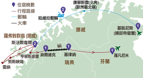 納爾維克前往瑞典邊境基律納路段風景最美,乘火車穿越震懾人心且粗獷闊達的風景區,包括壯觀的深谷和野生山地高原。