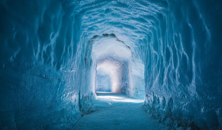 由當地一群工程師、專業建築工人及地球地質物理學家和冰河專家合作,在冰島第二大冰川朗格冰川內部,建造一條近800 公尺長,深度達300公尺的隧道,於2015年開通,目前可說是全世界最大的人造冰川隧道。進入冰川核心時,冰的顏色漸漸變得深藍,彷如一顆天然的藍水晶,璀璨奪目。