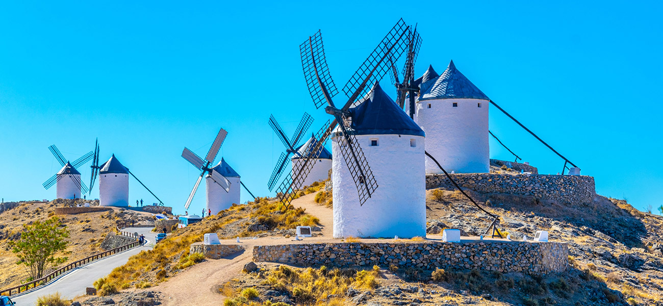 白色風車群在一片無垠的平原排列展開,構成典型拉曼查地區的鄉村風景。