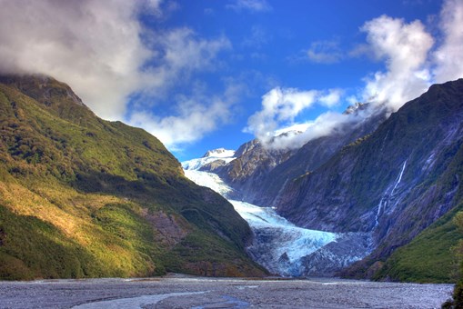 紐西蘭南島舉目是南阿爾卑斯山脈,其雪山群中約有三百多條冰川,以庫克山國家公園為發源地並已命名的冰川有72條,最著名的就是法蘭茲約瑟夫冰川和相鄰的福克斯冰川。