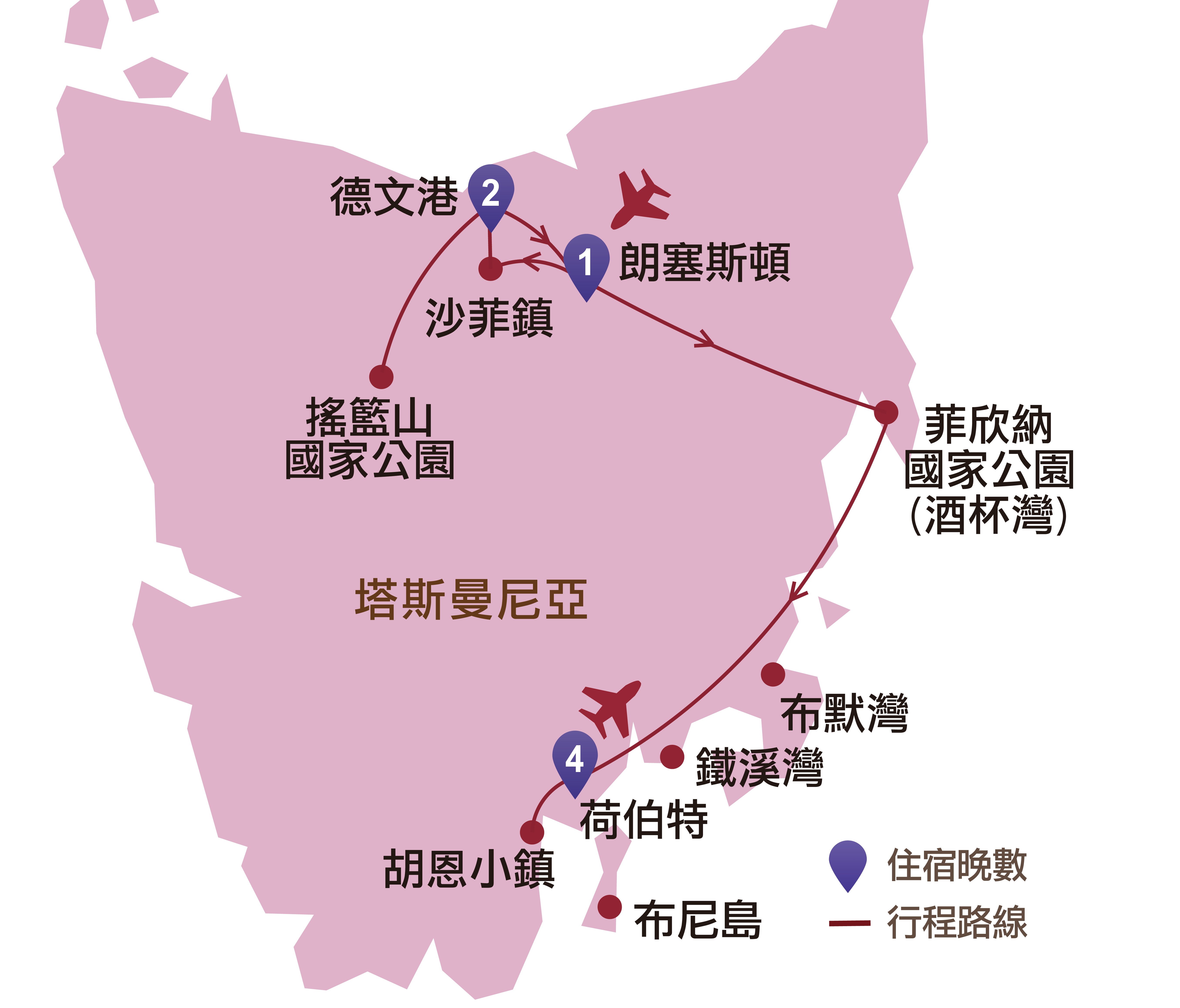 安排住宿塔省三個地區,連續兩晚入住德文港及四晚荷伯特市中心酒店