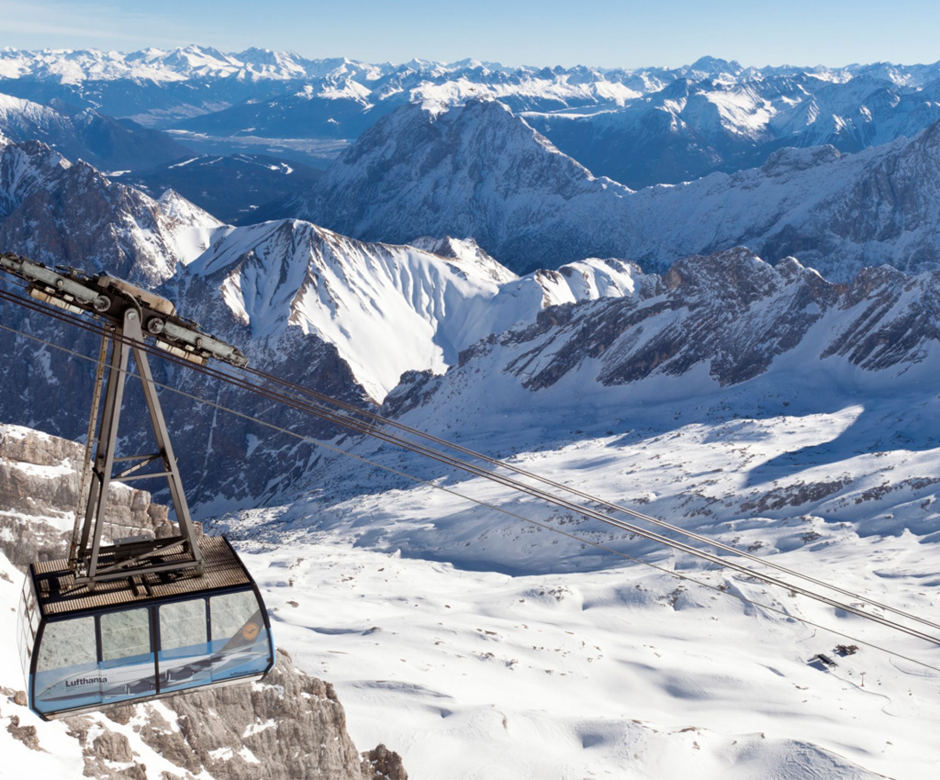 乘搭齒軌小火車及登山纜車登上近萬呎高峰。楚格峰是德國最高峰,也是德奧的國境交界,隸屬於阿爾卑斯山脈,山頂上終年積雪,在太陽照射之下山峰猶如戴上雪白帽子。觀景台上可盡覽阿爾卑斯山脈美景。