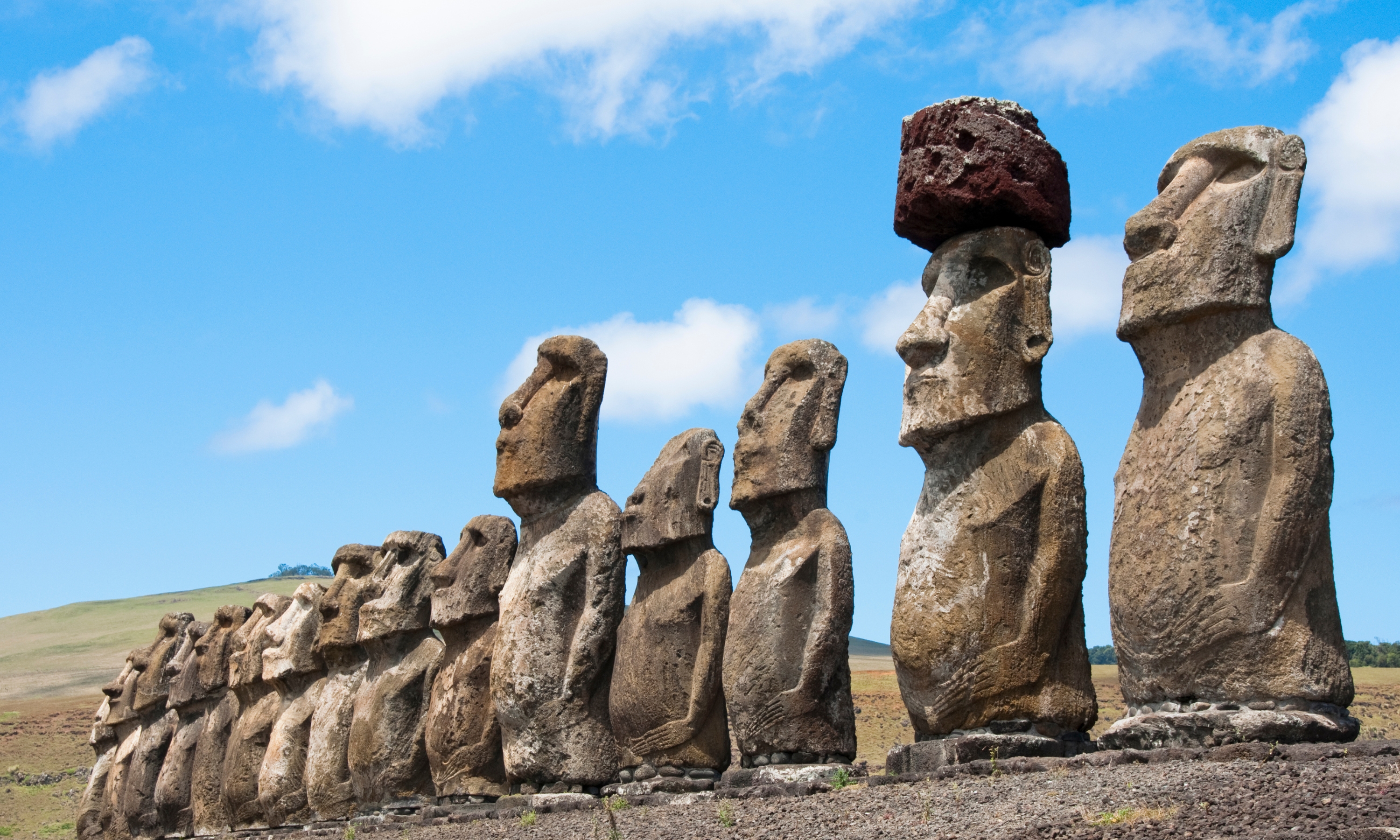 荷蘭人羅根維在 1772 年的復活節那天,發現了這個奇妙的島嶼,因此命名為復活節島。最引人注目的是遍布於島上超過 800 尊巨大無比的巨人石像:摩艾 (Moai) ,摩艾是由整塊石頭雕刻而成,雕工極為細緻,絲毫沒有刻痕。至今仍令人百思不解,在西元前 1680 年,古人是利用何種技術與工具,切割硬度極高的石塊,並刻出這栩栩如生的石像。