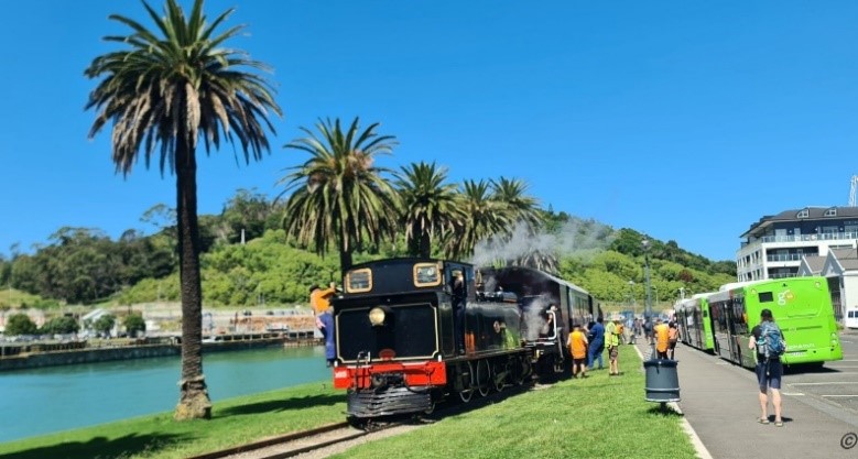 從碼頭步行鎮上火車站,登上著名之古董蒸汽機車WA 165號前往穆里瓦伊毛利文化村,沿途欣賞風景如畫的灣海岸線。