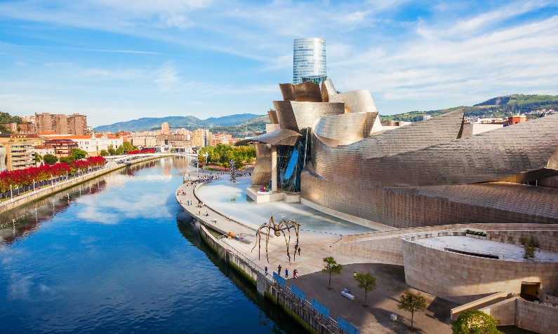 以奇特結構和嶄新材料得到舉世觸目。展出古根漢基金會的藝術收藏。主體建築覆蓋著鈦金屬薄板,閃閃發光,加上自由流動的曲線,被形容成酷似一艘太空戰艦。
