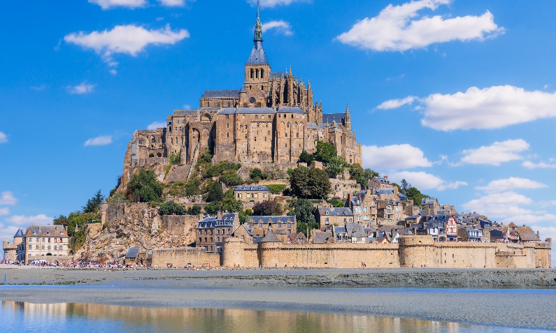 已聳立在山頂 1300 年,修道院頂上鍍金的聖米歇爾雕像傲視著整個山脈。 1979 年已被列為世界文化遺產。山下佈滿各式各樣的商店街,非常熱鬧。