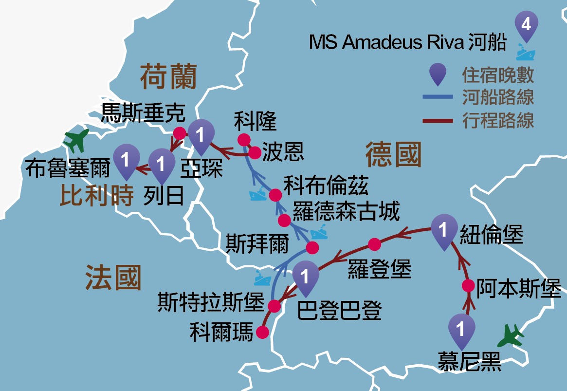 德國:慕尼黑、阿本斯堡、紐倫堡、羅登堡、巴登巴登、斯拜爾、海德堡、羅德森古城、科布倫茲、科隆、波恩、亞琛