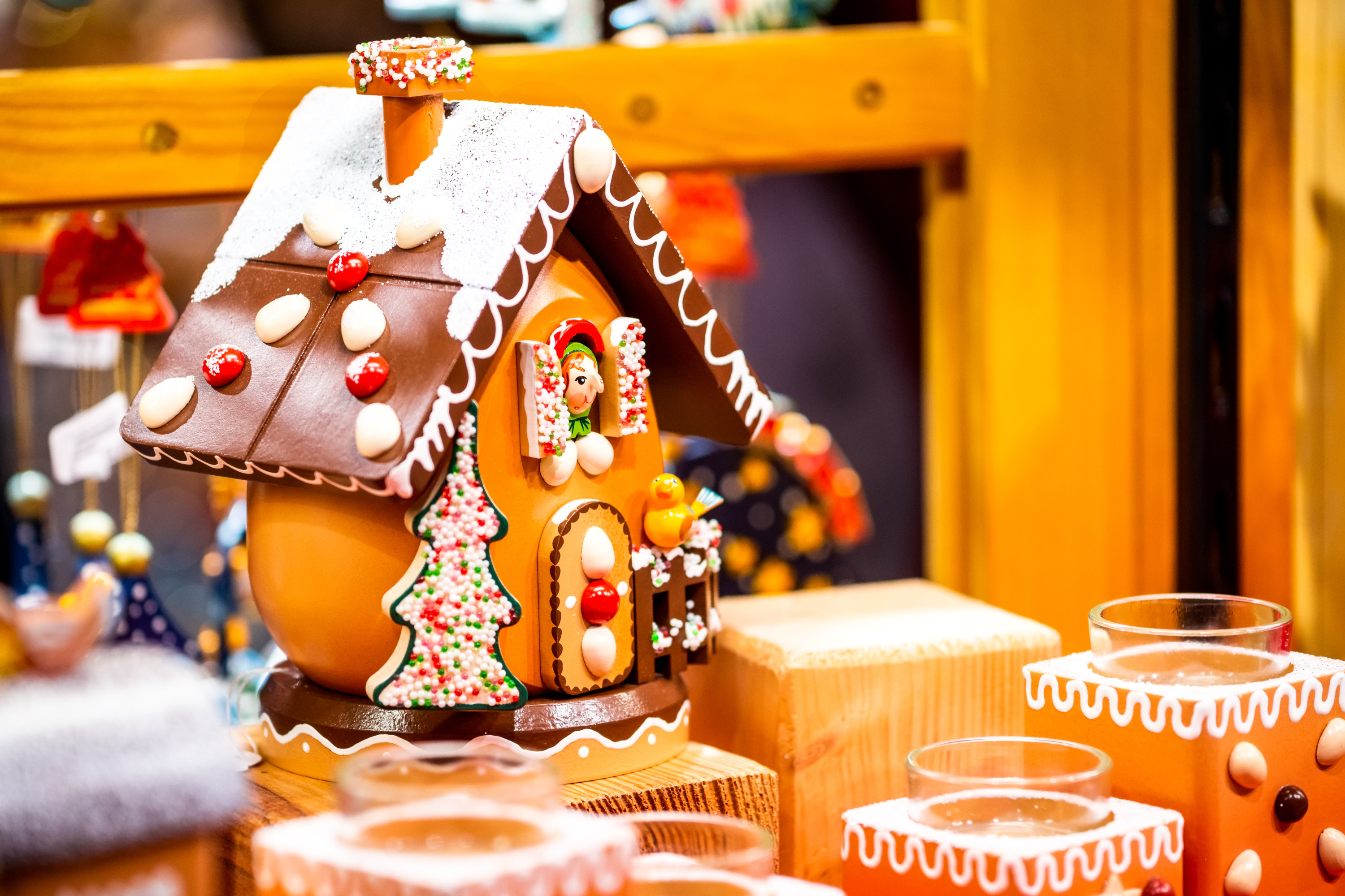 每個聖誕市集中都有很多地道小吃攤位,像是Pretzel(鈕結麵包)、酸菜、烤馬鈴薯、烤肉串、香腸等,不過最受歡迎的還是Glühwein (熱紅酒)。喝熱紅酒已成為聖誕市集的傳統,歐洲人喜歡大夥兒在寒凍下,依偎在高腳小圓桌喝酒聊天。置身於寒冷之中,遊客可以嘗試購買一杯熱紅酒暖暖身,購買熱紅酒時不妨選擇一些以精緻杯子盛酒的店舖,有些價錢已包含杯子的費用,喝完後可直接將杯子帶走,作為在聖誕市集中別具收藏價值的紀念品。聖誕節的經典甜食,首推源自德國的薑餅 Lebkuchen,以及後來廣受歡迎的薑餅人。據文獻記載,史上第一塊薑餅人誕生於伊莉莎白一世時期——她命令烘焙師將薑餅製作成重要客人的模樣,藉此表達敬意。自此薑餅人風靡全德國,薑餅屋也隨之登堂入室,成為聖誕餐桌上不可或缺的食品。