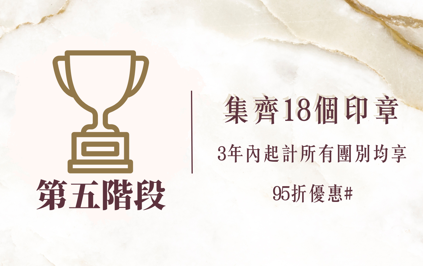 5. 第五階段之獎賞(即95折優惠)只適用於尊賞假期指定門市使用。(即第19個團或之後需在尊賞假期指定門市報名。)