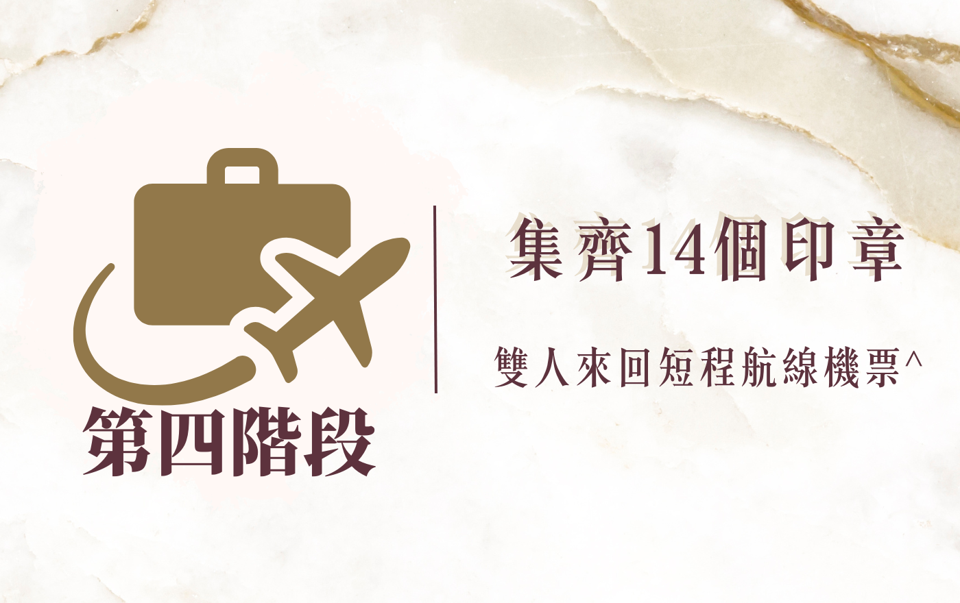 4. 雙人來回短程航線機票將會在參加者獲得第十四個印章起一年(365日)內有效,包括兌換及出發。得獎者必須在有效期內前往尊賞假期指定門市 (尖沙咀、銅鑼灣) 完成兌換及於有效期內出發,逾期恕不補發。
