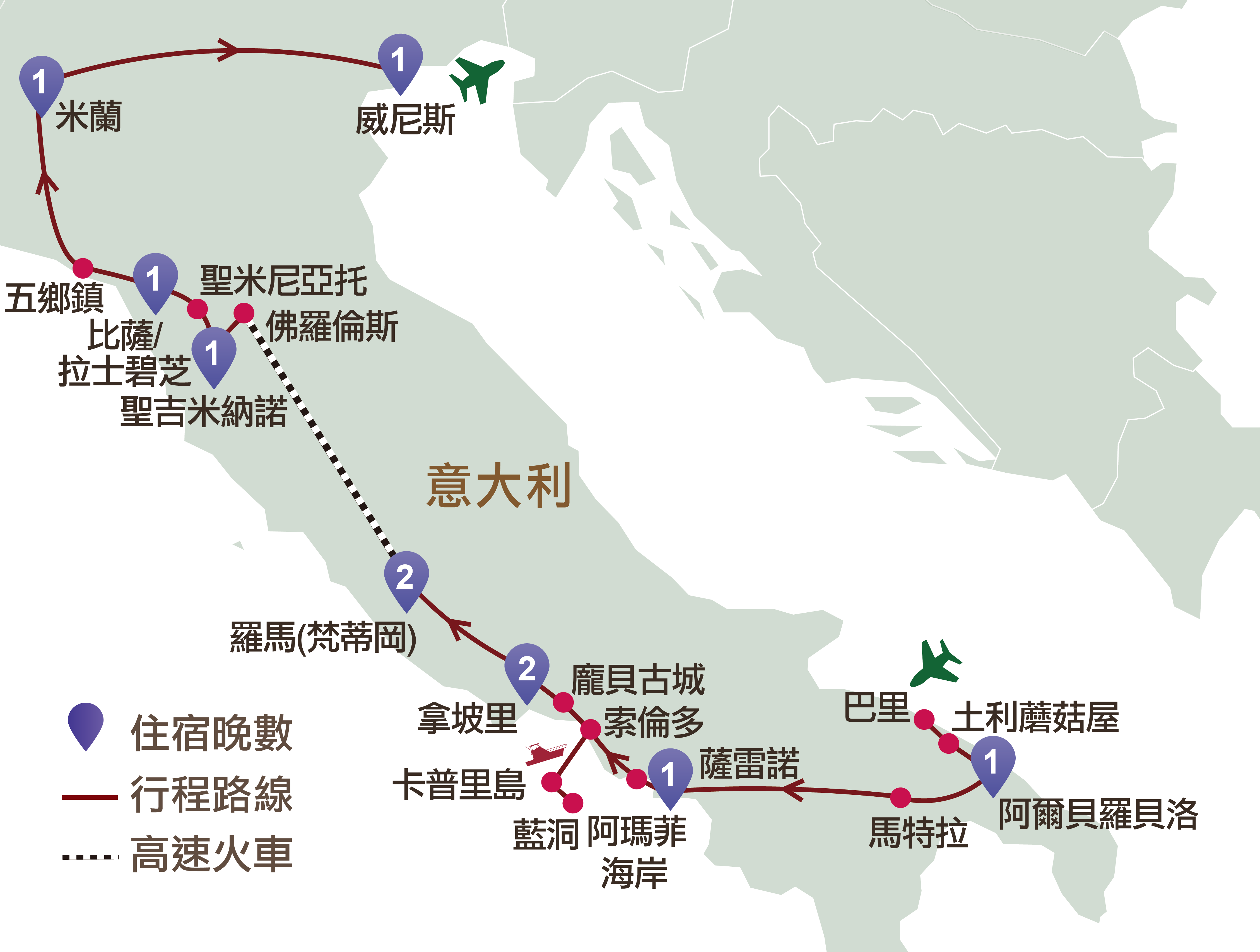 巴里、阿爾貝羅貝洛、馬特拉、薩雷諾、阿瑪菲海岸、索倫多、龐貝/拿坡里、羅馬、梵蒂岡、佛羅倫斯、聖吉米納諾、聖米尼亞托、比薩/拉士碧芝、五鄉鎮、米蘭、威尼斯、布拉諾島(彩色島)