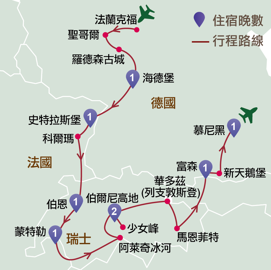 德國:法蘭克福、聖哥爾、海德堡、富森/肯普田、慕尼黑 | 法國:史特拉斯堡、科爾瑪