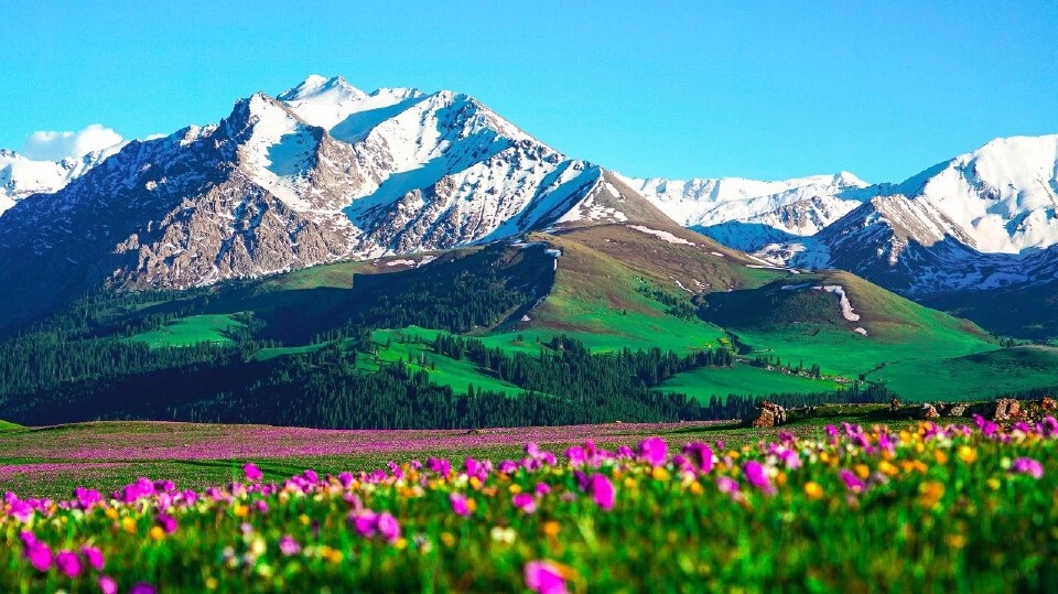 《喀拉峻》哈薩克語,意為「山脊上的草原」。每年五六月,草原迎來最美的時刻,雲杉森林與五色花海,鍍成精美的油畫。皚皚雪峰幻化出五色光芒。芳草鮮美、繁花似錦,地毯般延伸至遊客眼前,令人流流連忘返。