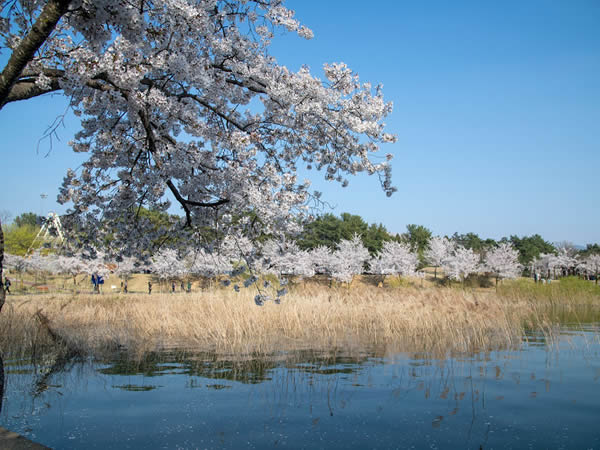 普門湖畔賞櫻花: 普門湖是一個人工湖,映照出周圍的櫻花樹和自然風光。這湖邊種植了大量櫻花樹,主要以王櫻花為主。湖面寬廣,面積達50萬坪,周圍環境優美。