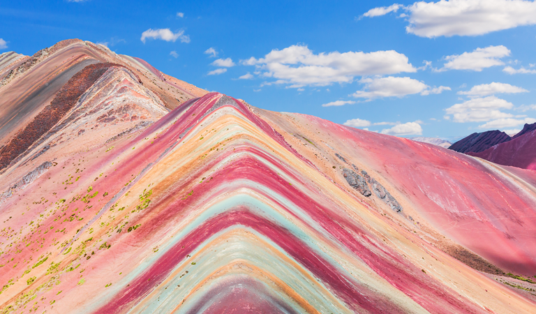 位於安地斯山脈的七彩山麓,因顏色繽紛而有「彩虹山」稱號,這座層次分明的美麗山脈位於海拔高達5000公尺以上,是屬於少見的「丹霞地貌」,所謂「丹霞地貌」是指一種沉積在內陸盆地的紅色岩層,這種岩層經過千百萬年以上的地質變化過程、被水切割侵蝕,最後才形成了我們眼睛所見的「紅色山麓」。