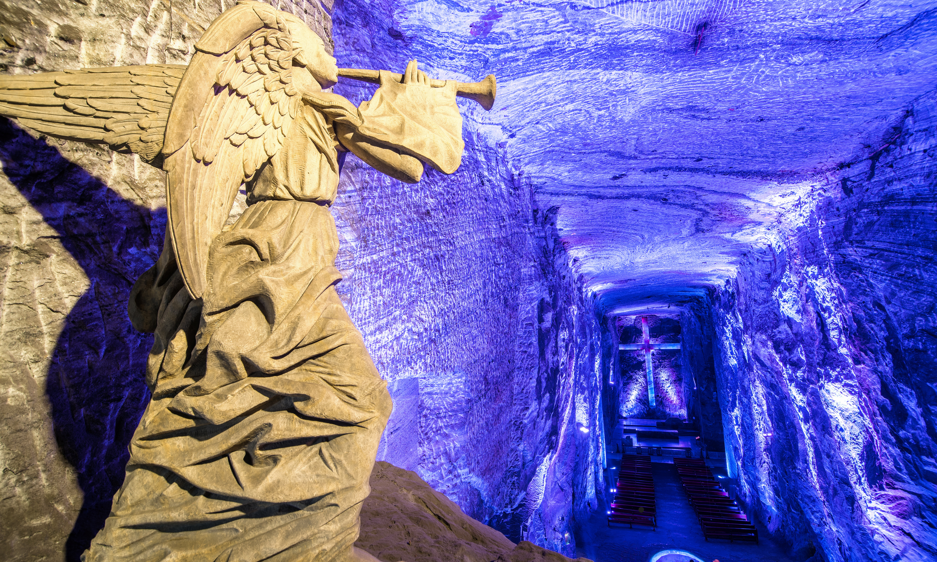 岩鹽在2.5億年開始前形成,位於安第斯山脈中東部,7000萬年前,海域覆蓋了該地區。隨著東部山脈的形成,海水蒸發了,在泥土中埋下了大量鹽分,凝固直到變成鹽的岩石。它被埋在Zipa山(最重要的土著酋長的名字)的深處,海拔2652米,平均溫度為14˚C。教堂位於鹽礦深處,起初是礦工用作祈禱之用。整個教堂包括十字架均由鹽塊雕刻而成,要建造鹽教堂,必須挖取250,000噸岩鹽。每個教堂中殿都有由礦工和雕刻家雕刻的精美雕塑。昏暗的環境配上五顏六色的燈光,非常震撼。吸引了來自世界各地的一千三百萬遊客。