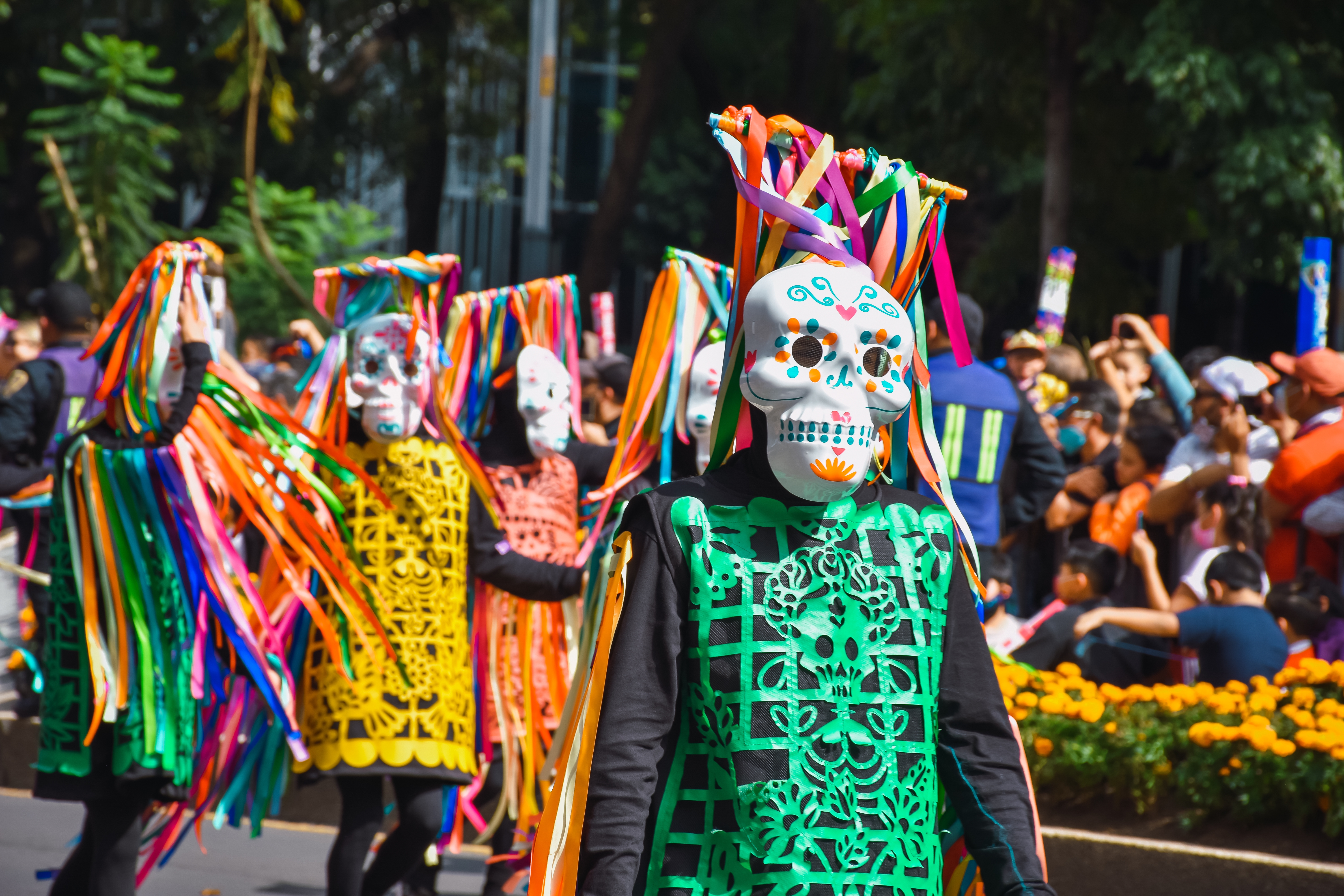 參與一年一度盛大的亡靈節大遊行。墨西哥人會用慶典與狂歡為逝去的人祈福,用藝術佈置、特色美食、歡樂遊行來展現對於生命的瀟灑及豁達。街上會掛起一串串彩色的小旗子,地面鋪滿鮮豔明亮的萬壽菊,是世界上獨一無二的大派對,當地人會穿上印有白骨的衣服,化上逼真的骷髏妝,走上街頭用歡笑與喜悅迎接親友亡靈的歸來,隆重地慶祝生者與亡靈一年一度的團圓。