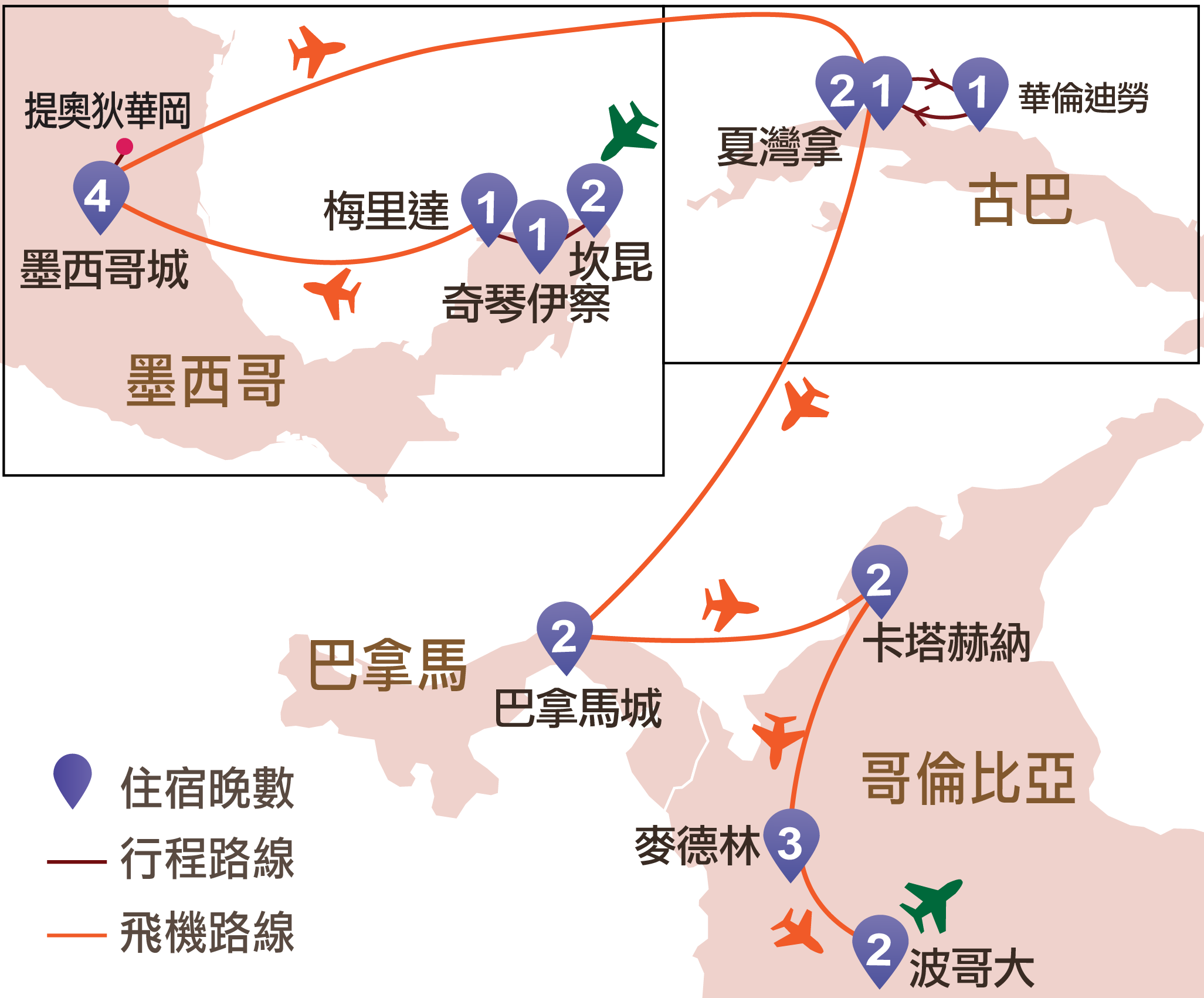 古巴:夏灣拿、奔納里奧、溫尼斯山谷、柯西瑪、華倫迪勞 | 巴拿馬︰巴拿馬城