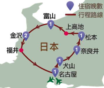 犬山 (寂光院) 、松本、上高地、飛騨、富山 (玻璃美術館)、金澤、名古屋