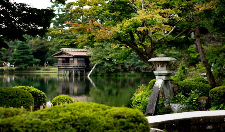 兼六園: 庭園始建於1676年,由第五代加賀藩主開始規劃,歷經多代藩主長時間擴建,於1822年基本完成。庭園採用迴遊式設計,園內有大池塘、假山、亭台與茶室等多樣景觀,可沿曲徑漫步,欣賞四季變化的花木與自然美景。