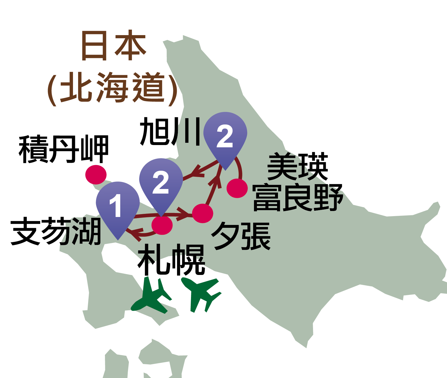 支芴湖、夕張、旭川、美瑛町、富良野、札幌、積丹岬