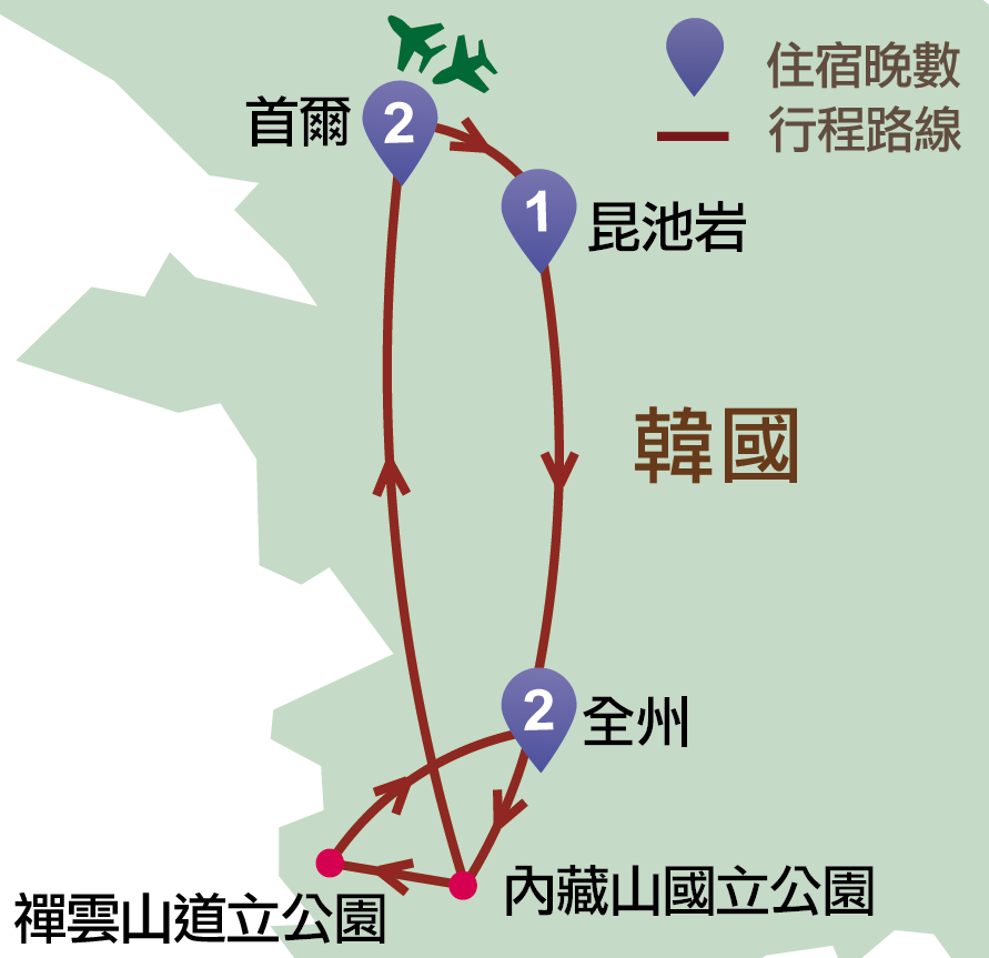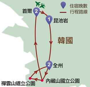 全羅南道(白巖山白羊寺)、首爾(天空公園、昌德宮後苑、成均館大學明倫堂、明洞、南大門市場)