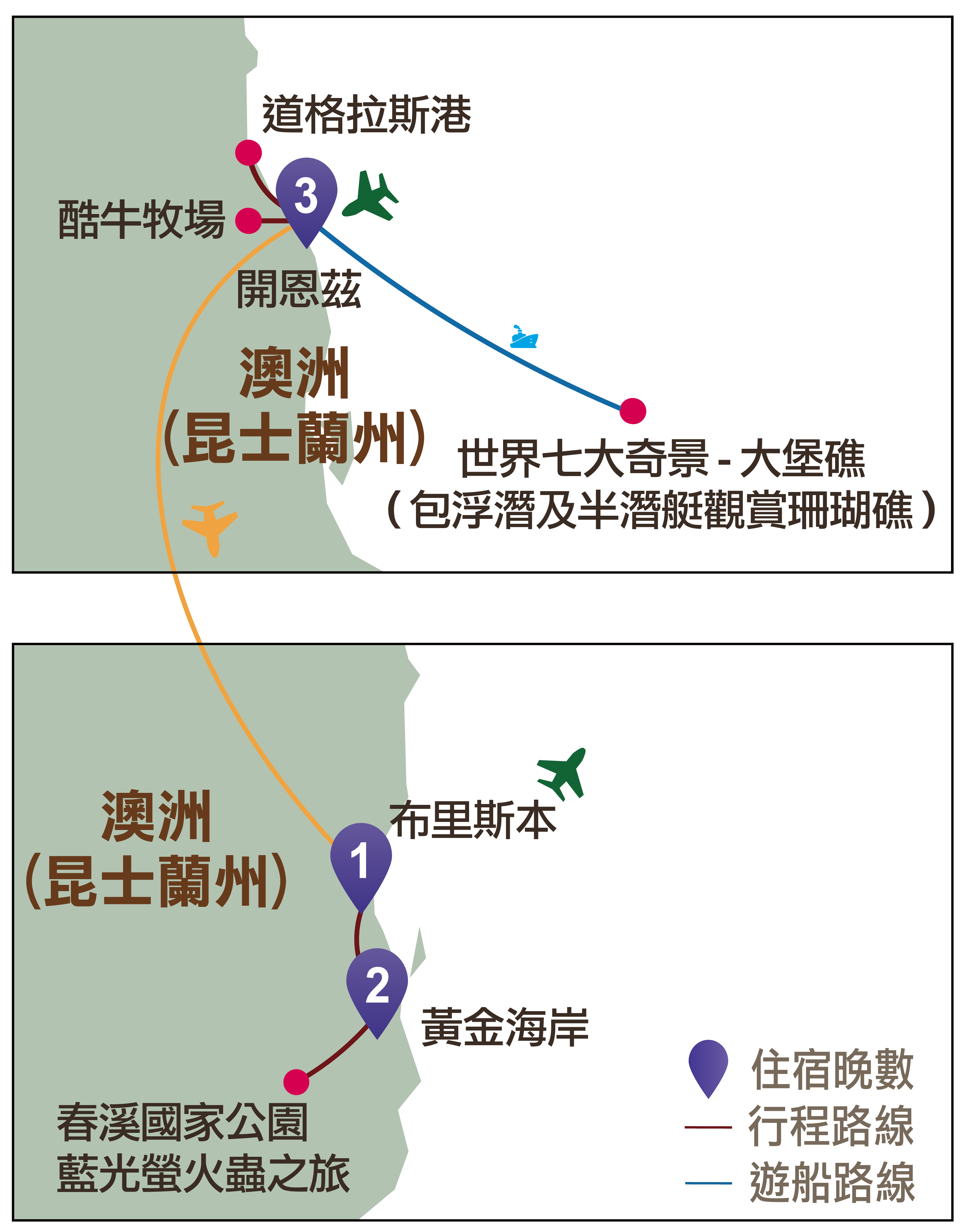 酷牛牧場地道澳洲農場體驗︰乘坐乾草車賞景與餵牛,及在迷你動物園與可愛小動物親密互動;哈特利鱷魚探險公園︰除觀賞鱷魚,還有樹熊、蜥蜴、蛇等野生動物;黃金海岸海岸邊︰親手餵食成群的野生大嘴鳥;在大堡礁,親身浮潛觀賞珊瑚、魚類、海龜、海豚等海洋生物。