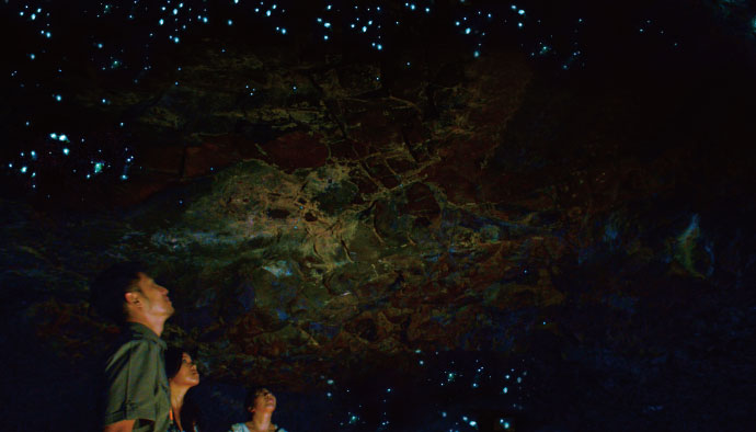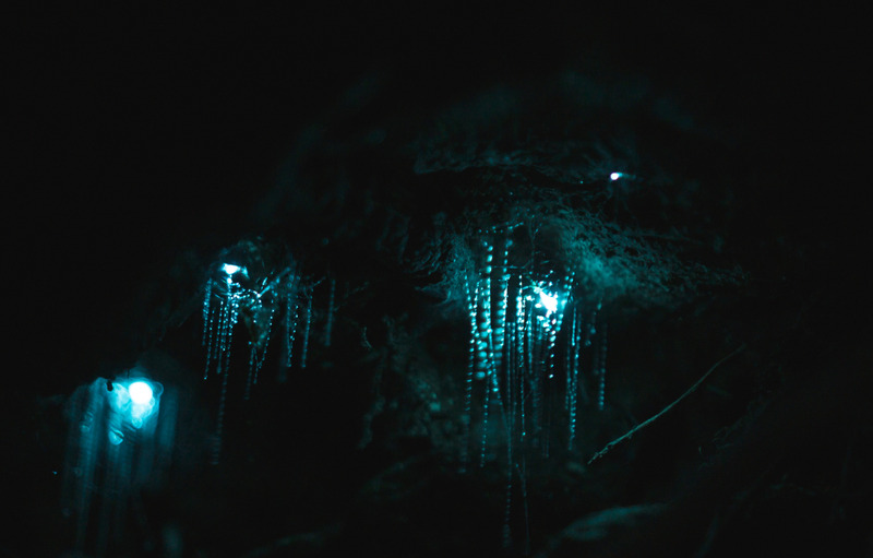 夜幕降臨後,進入自然橋拱洞,觀賞世界罕見的藍光螢火蟲。牠們附著在岩壁上,閃爍如星空般的藍色微光,營造出如夢似幻的景象!
