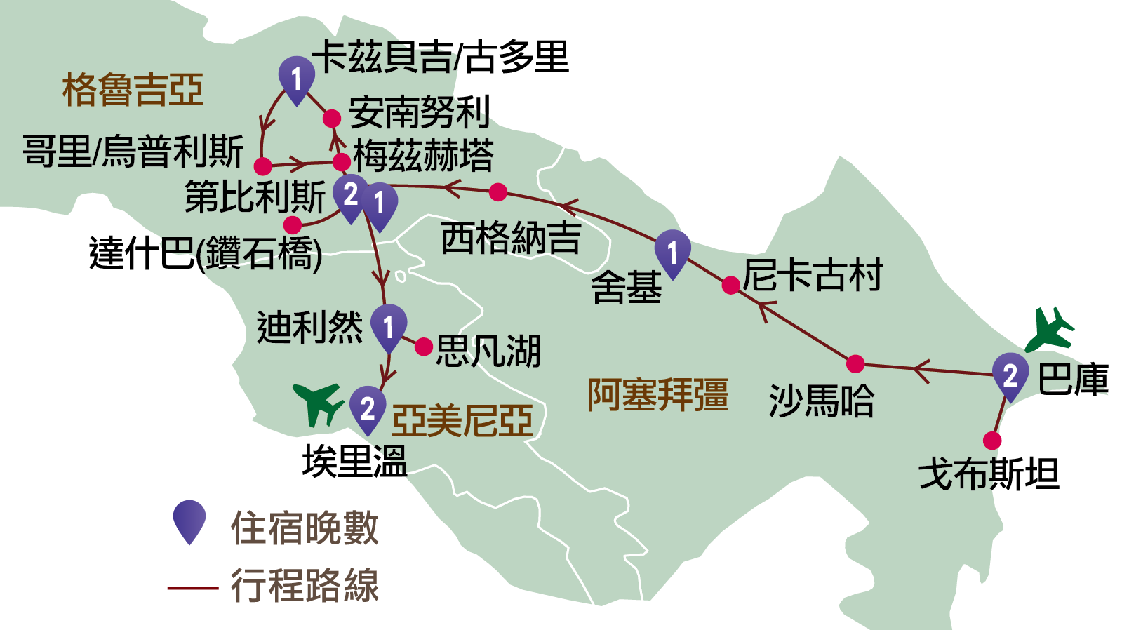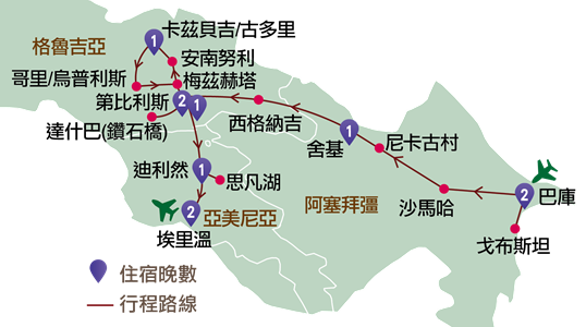 格魯吉亞:西格納吉、第比利斯、達什巴(鑽石橋)、梅茨赫塔、安南努利、卡茲貝吉、哥里
