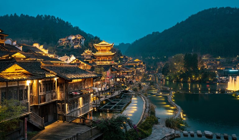 貴州新晉網紅景點,集烏篷船、吊腳樓、燈光表演及原生態的自然風光。夜宿烏江寨,深度體驗黔北的寧靜。晚上可在廻龍島看表演:烏江星音樂水舞秀、無人機燈光表演、欣賞孔明燈放飛的夜景等。