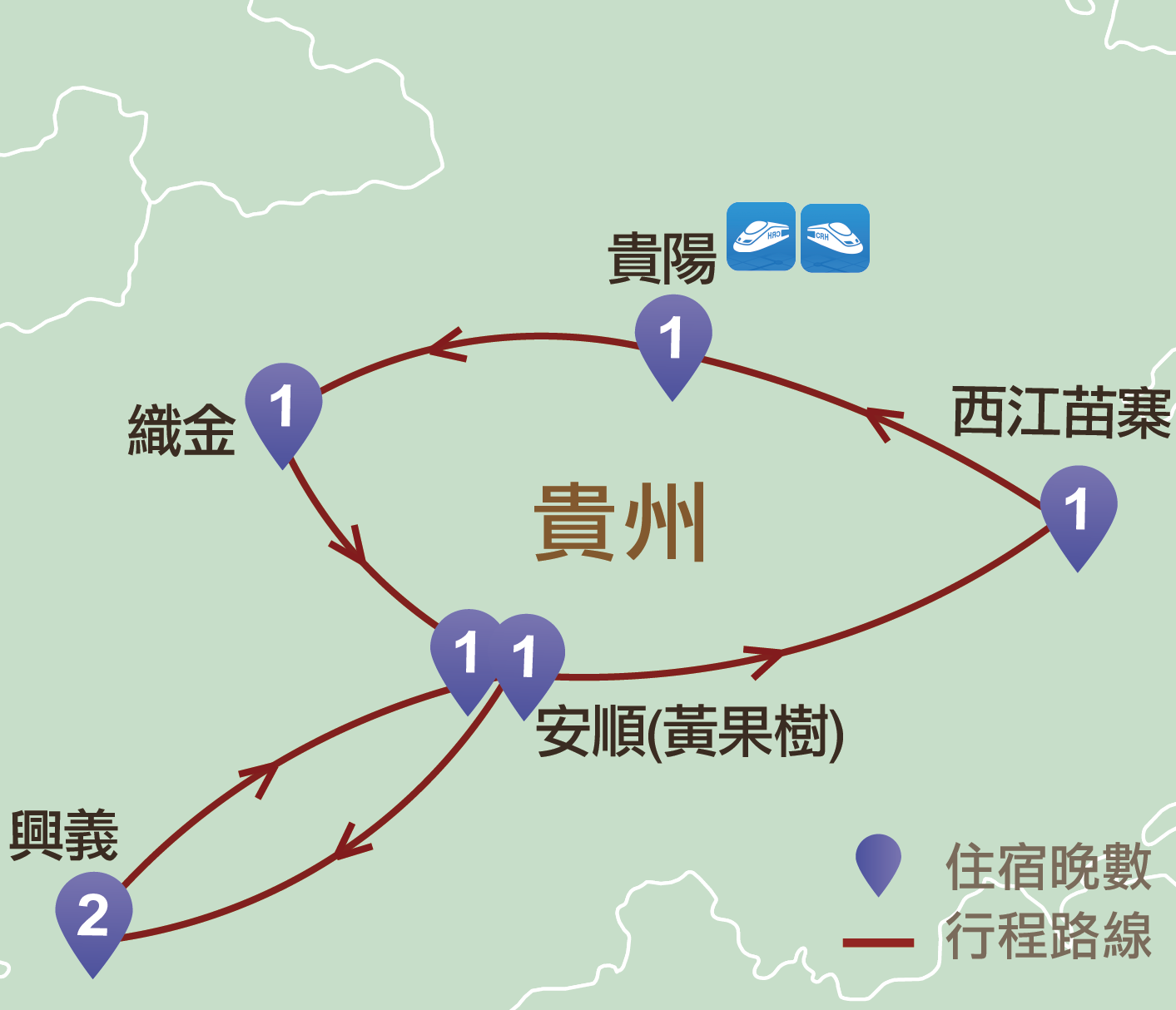 貴陽、織金、安順《龍字田、黃果樹瀑布》、平壩《萬畝櫻花園》、貴定《金海雪山.油菜花及李花》、西江《千戶苗寨》、興義《貴州醇櫻花園、萬峰林、萬峰湖、花江峽谷大橋、馬嶺河峽谷》