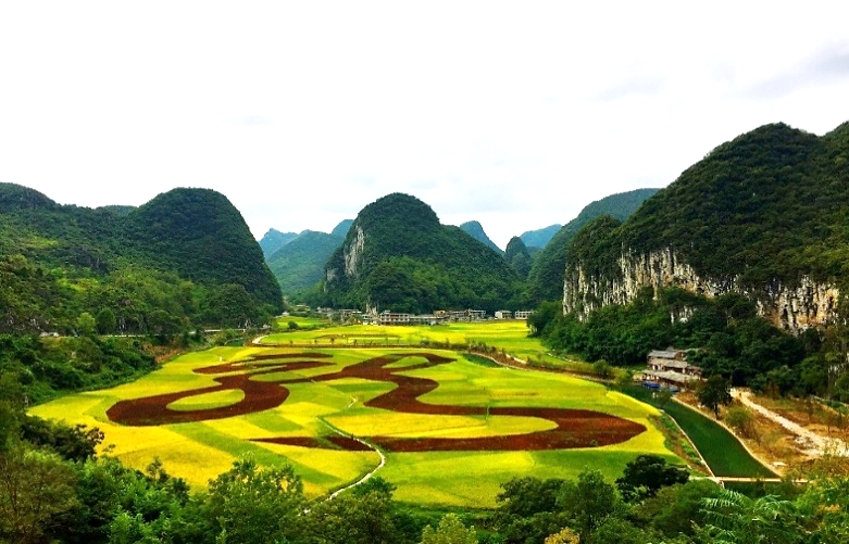 安順龍宮標誌性景觀,120 畝植物漢字 “龍” 建於山間梯田。春黃夏綠映山水,堪稱天下第一龍字。