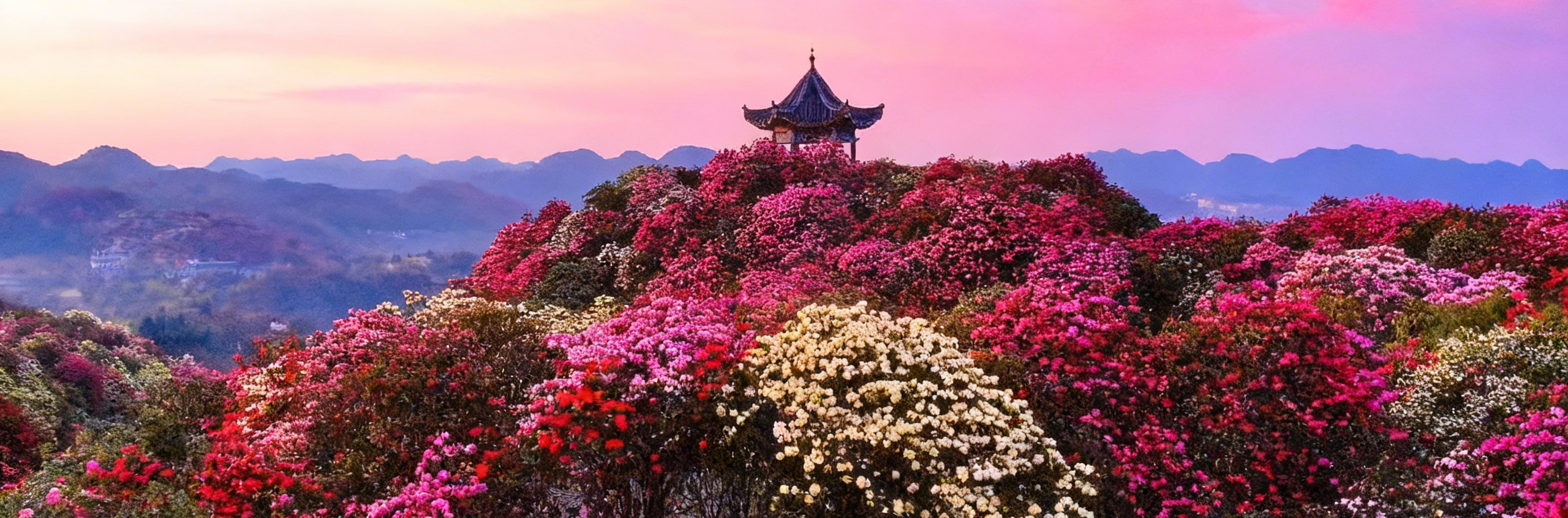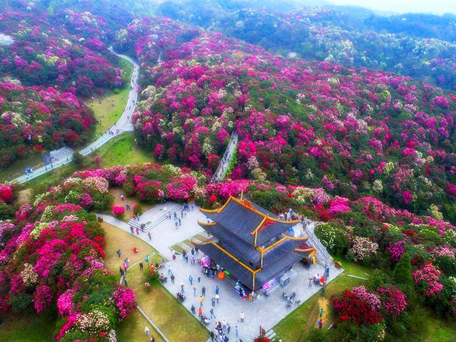 百里杜鵑: 四季風光各異,緋紅、粉白、淡紫等數十種花色織就「地球彩带」,被譽為「世界上最大的天然杜鵑花園」,是國家 5A 級旅遊景區與世界唯一的杜鵑花國家森林公園。