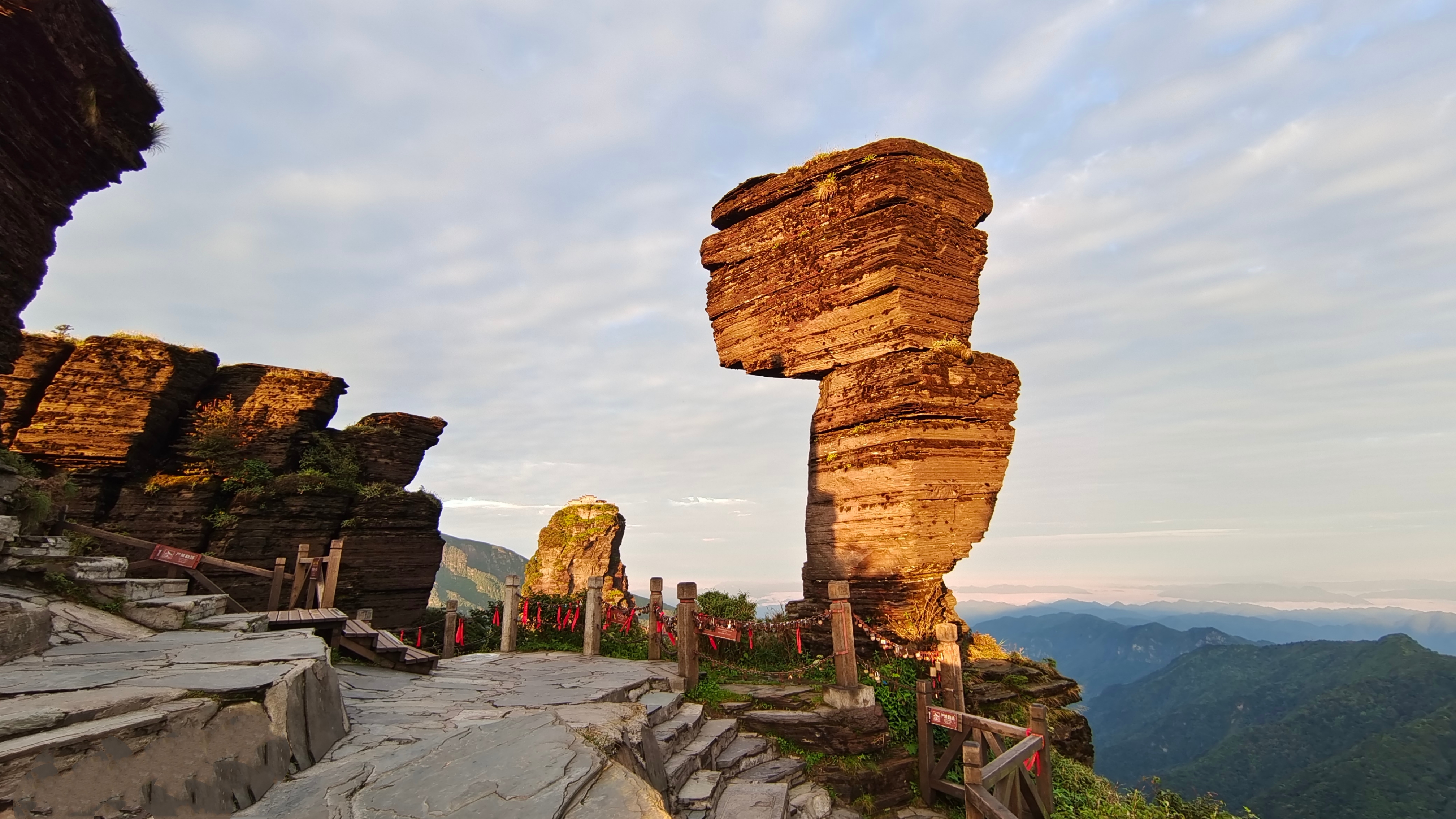 梵淨山風景區(含觀光車+往返纜車): 梵淨山得名於「梵天淨土」,是國家5A級旅遊景區,是武陵山脈的主峰,為中國十大避暑名山,中國著名的彌勒菩薩道場,同時也是世界自然遺產。主要景點:紅雲金頂(視天氣狀況預約登頂)、承恩寺、普渡廣場、蘑菇石等。。每年 9-11 月秋季紅葉禪意,9-10 月乾燥少霧,偶現「梵淨佛光」; 10 月下旬至 11 月初,楓香、槭樹染紅整座山巒#。