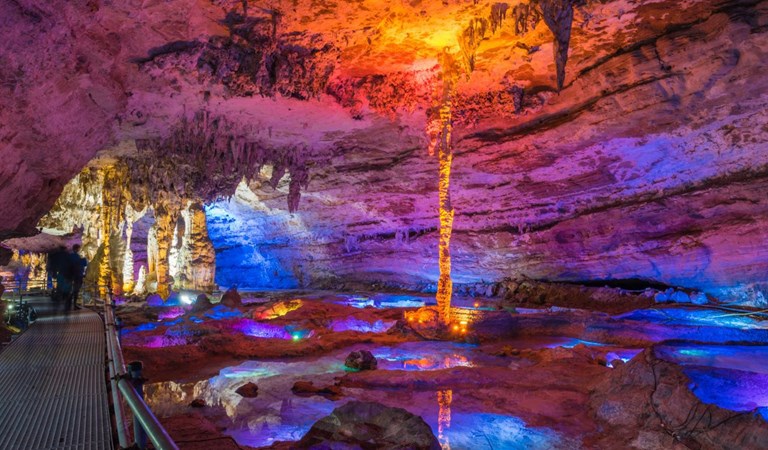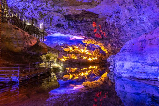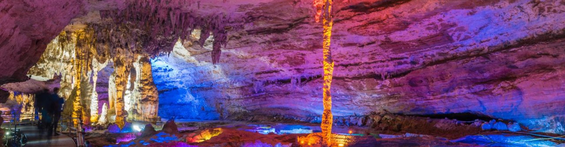 十二背後雙河谷景區: 雙河谷由地下河谷、天坑、石膏洞組成,擁有豐富的地下岩溶地貌。洞內乘坐電瓶車在歷經4億年形成的雙河石膏洞中穿行,完成一次時光穿梭之旅。