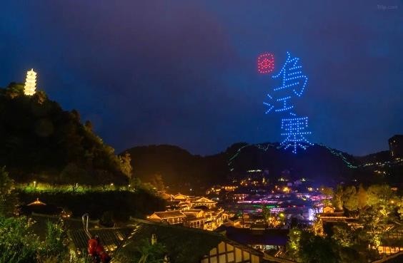 烏江寨尊屬區域欣賞表演: 晚上可在廻龍島觀看烏江星音樂水舞秀、無人機燈光表演及篝火晚會等。