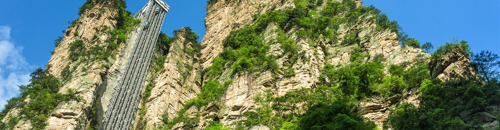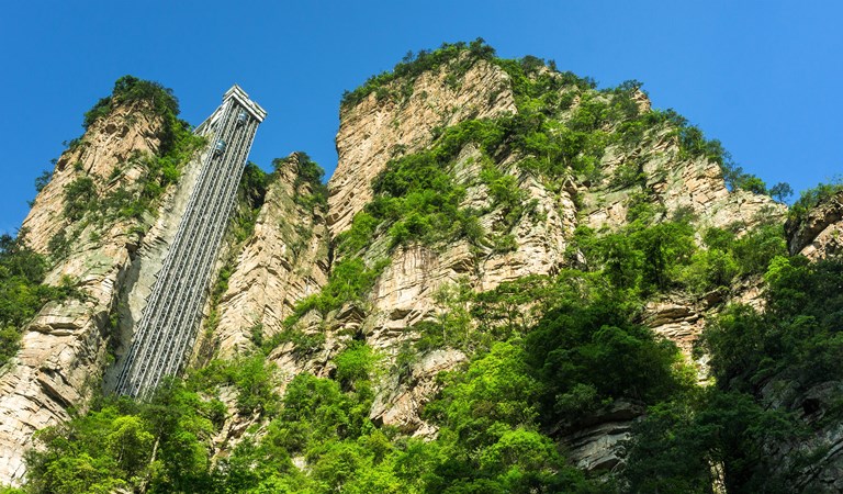 百龍天梯: 世界最高、載重最大、速度最快的全暴露戶外觀光電梯,可飽覽袁家界壯麗景色。