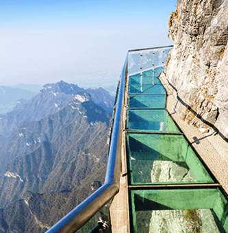 大峽谷雲天渡玻璃橋: 是目前世界最高、跨度最長的玻璃橋。全透明的玻璃橋面,橫跨張家界兩個山脈之間的峽谷,腳下400米處的山谷底風光盡收眼底。