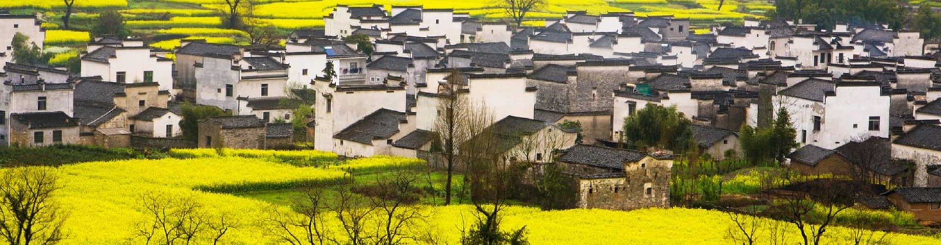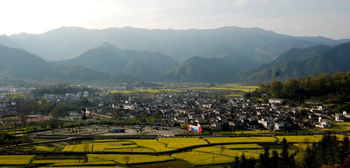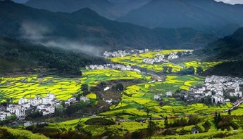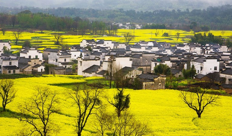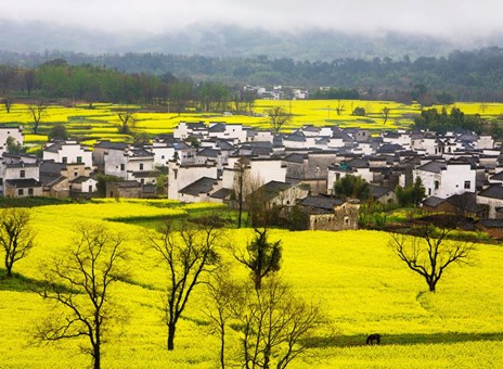 宏村: 被譽為「中國畫裡的鄉村」,以其獨特的徽派建築和精美的水系統聞名於世。於2000年被列入《世界文化遺產名錄》。春季時,金黃的油菜花田與傳統的粉牆黛瓦相互輝映,增添了豐富的層次感。
