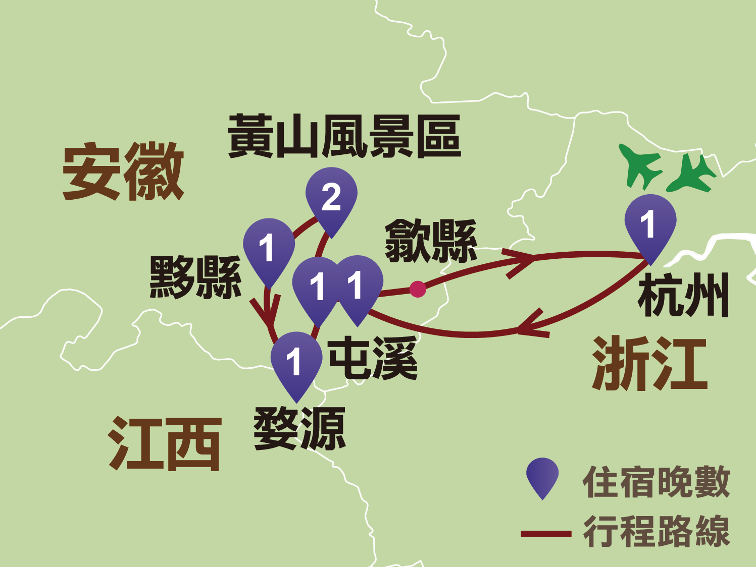 安徽(黃山、屯溪、黟縣宏村、盧村、歙縣)、江西(婺女洲度假區、婺源篁嶺)、浙江(杭州)