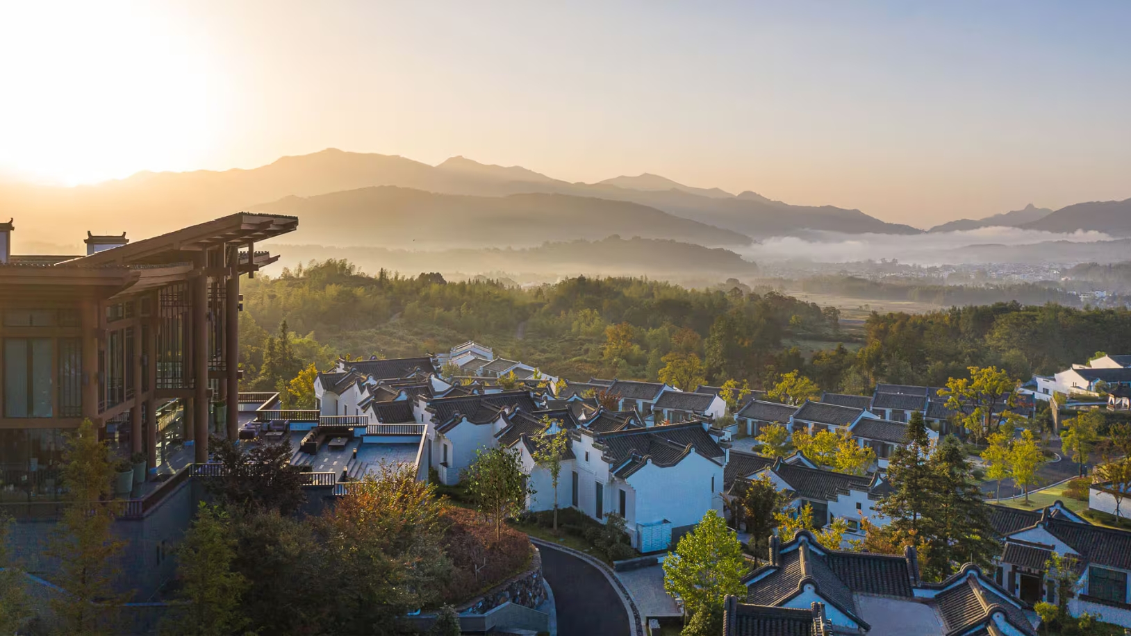 坐落於宏偉的黃山腳下,籠罩在雲霧中的黃山飄渺如仙境,以當地徽派建築文化為設計靈感,仿木構的坡屋頂、黛瓦、馬頭牆,與周圍環境完美融合。