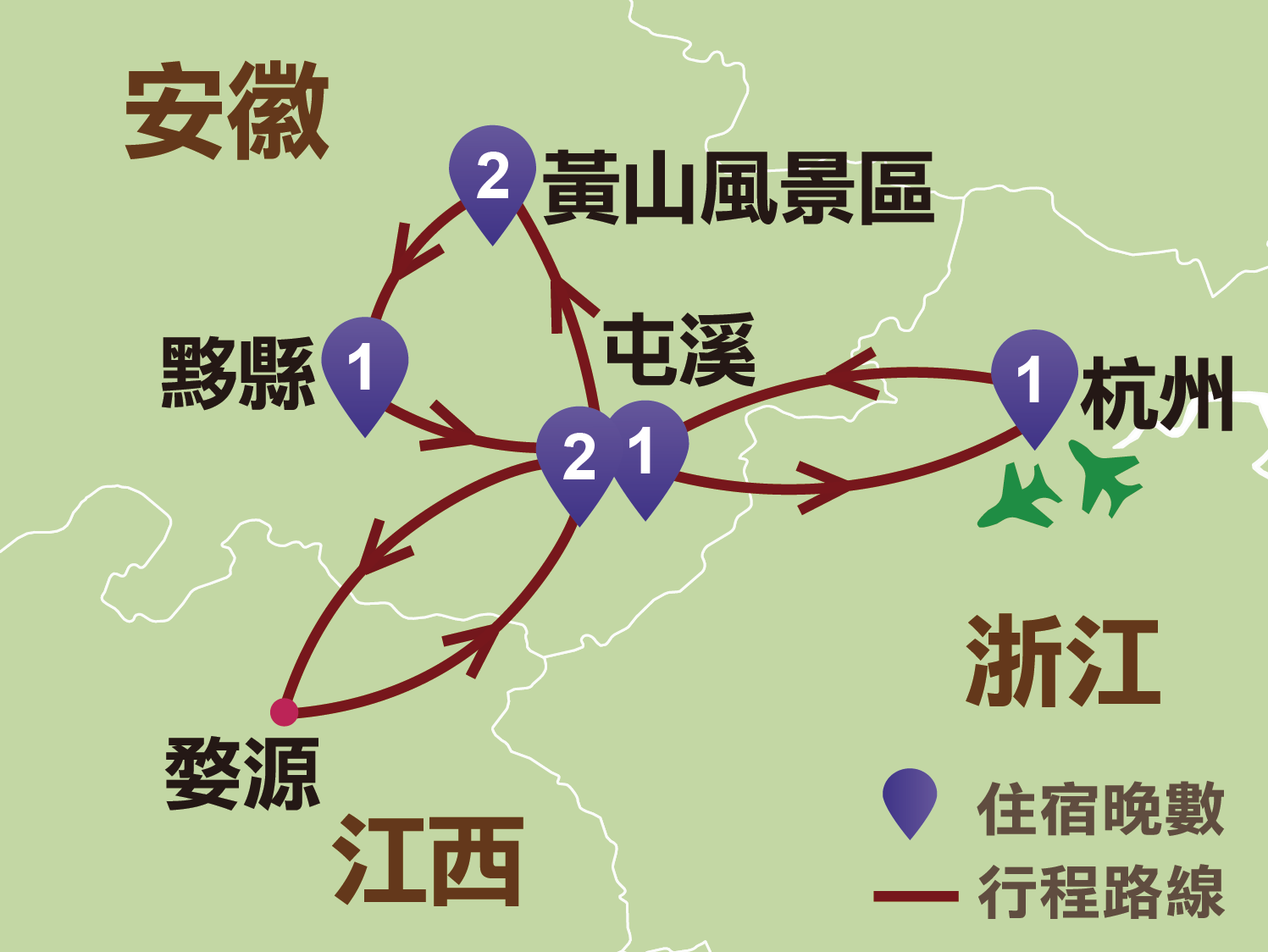 安徽(黃山、屯溪、塔川、宏村、西遞)、江西(婺源篁嶺、江灣)、浙江(杭州)