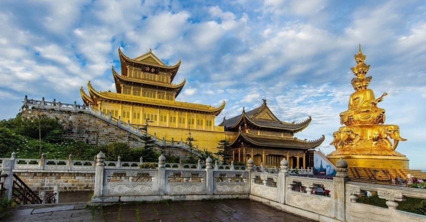 報國寺: 峨嵋山第一大寺, 建於明萬曆年間(1573—1619年),原名會宗堂,取儒釋道三教會宗之意。是峨嵋山佛教活動的中心。